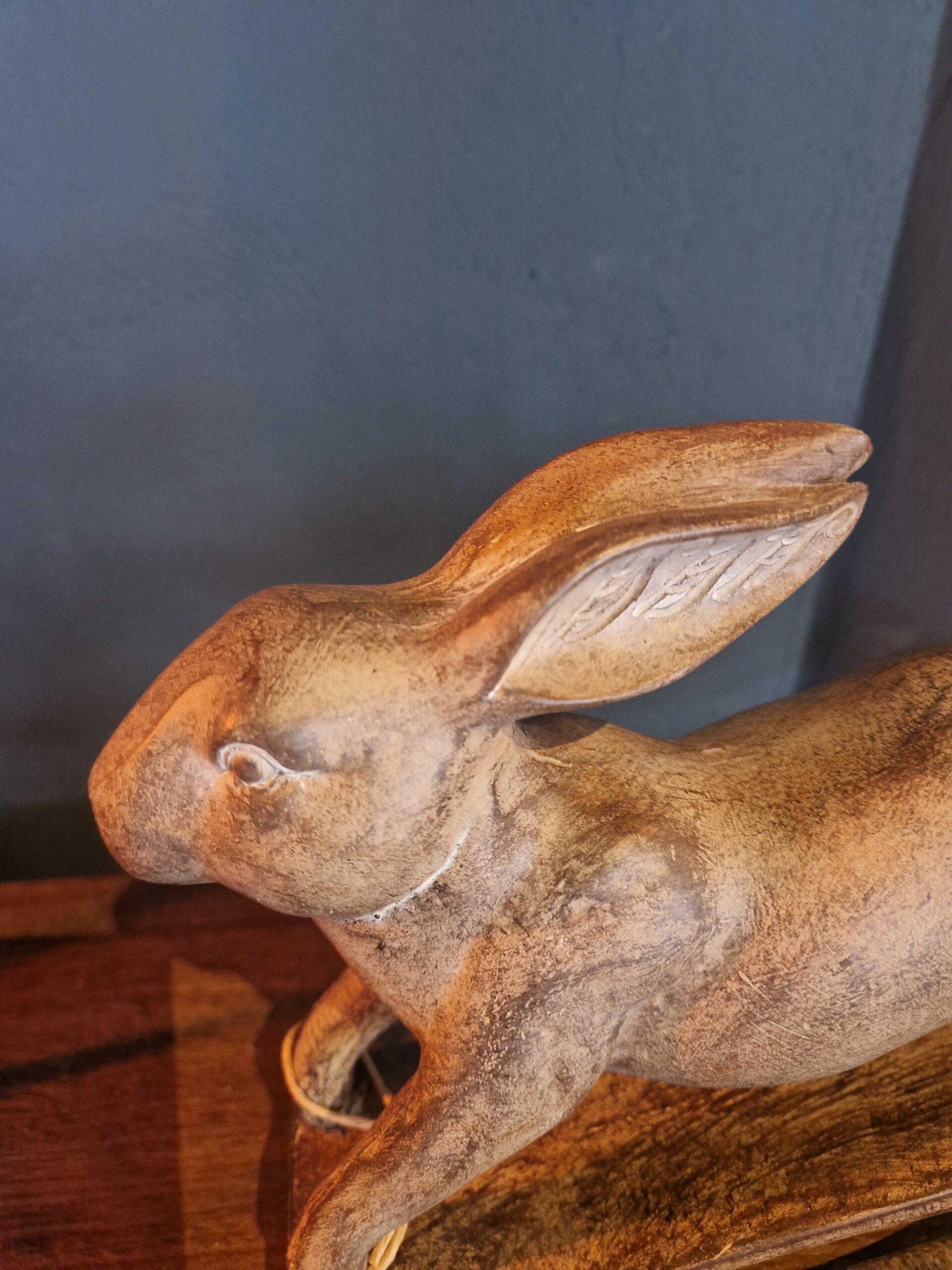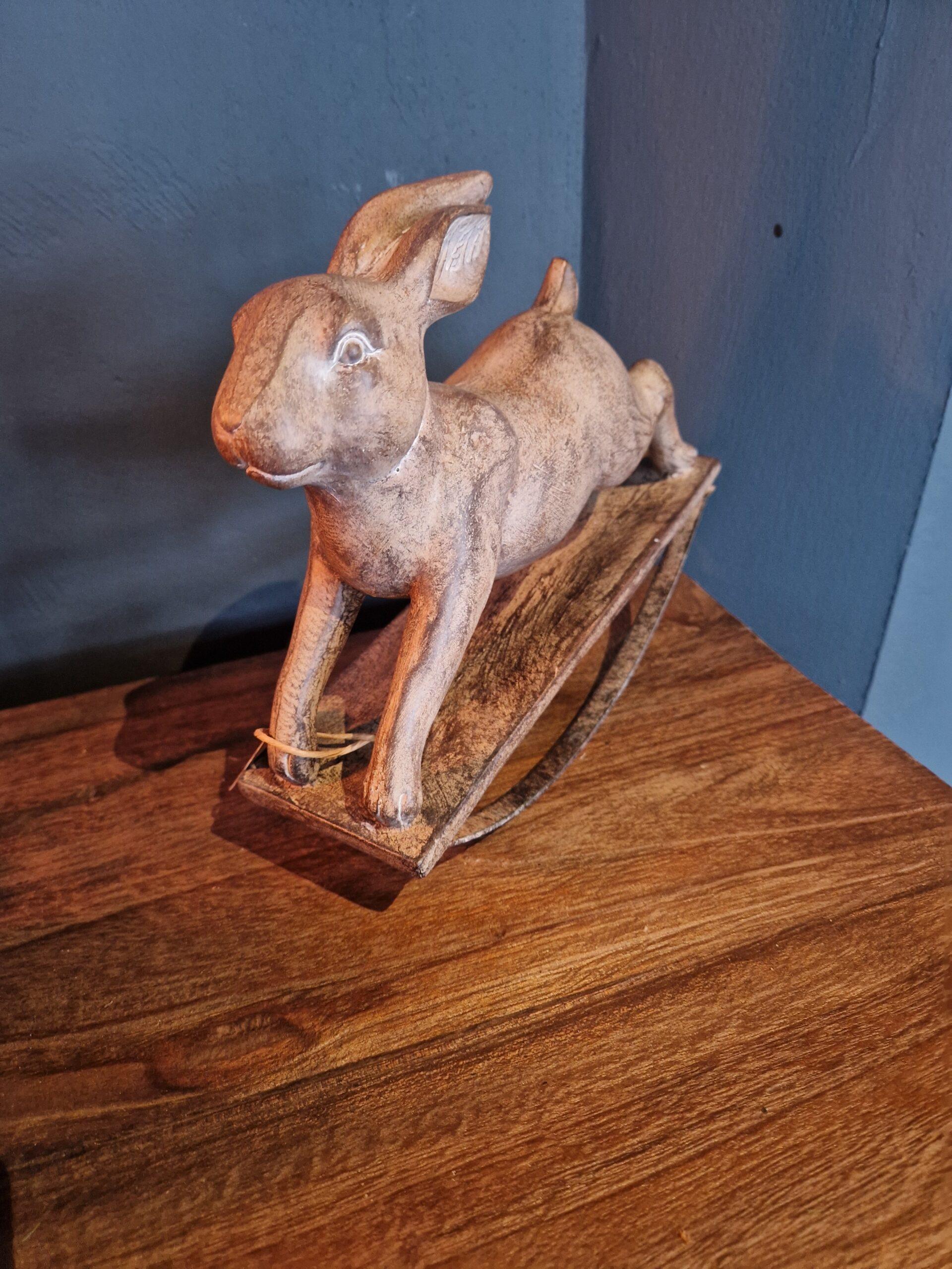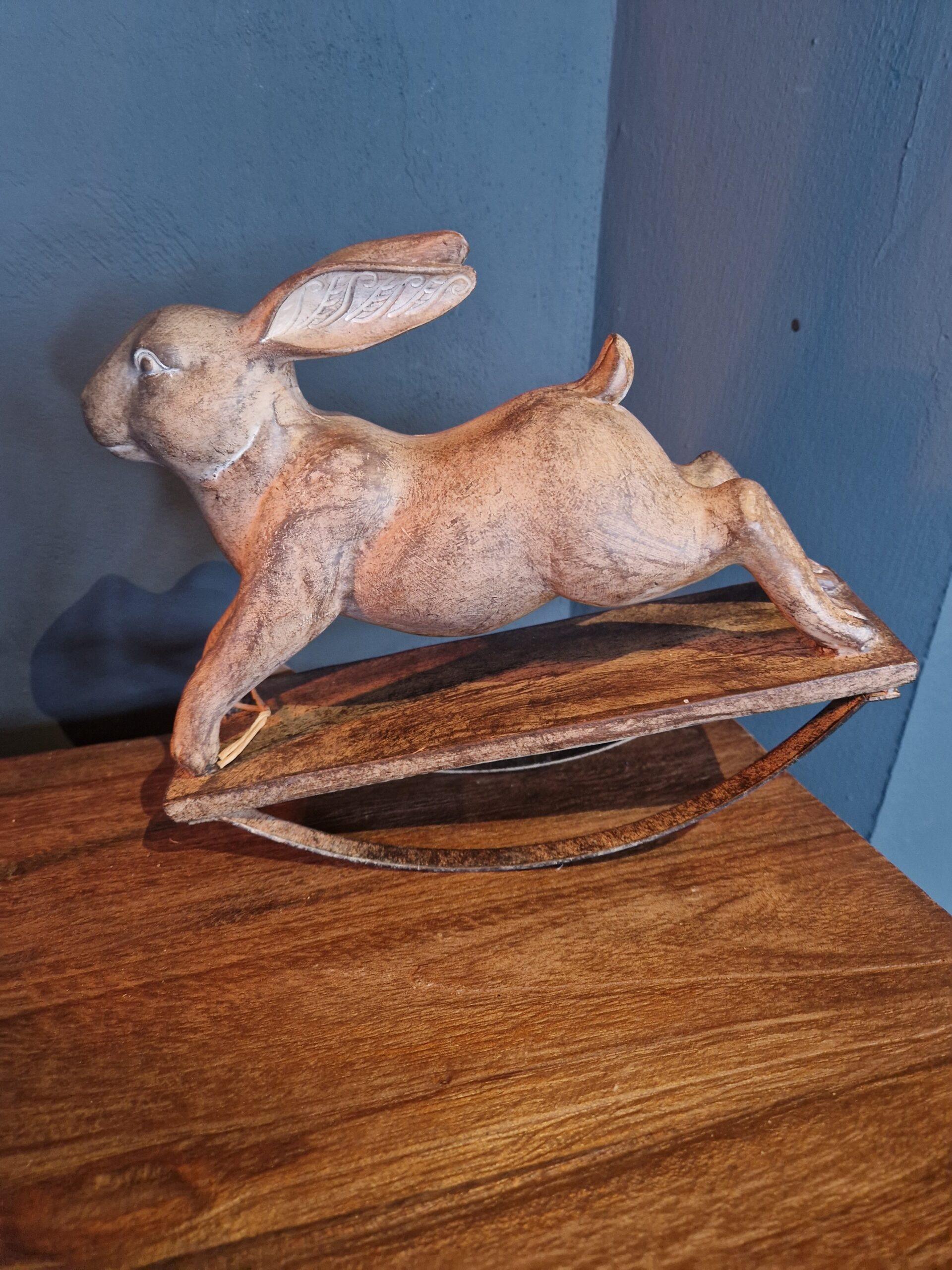 Zo mooi. Een houten konijn op een ijzer schommel onderstel.