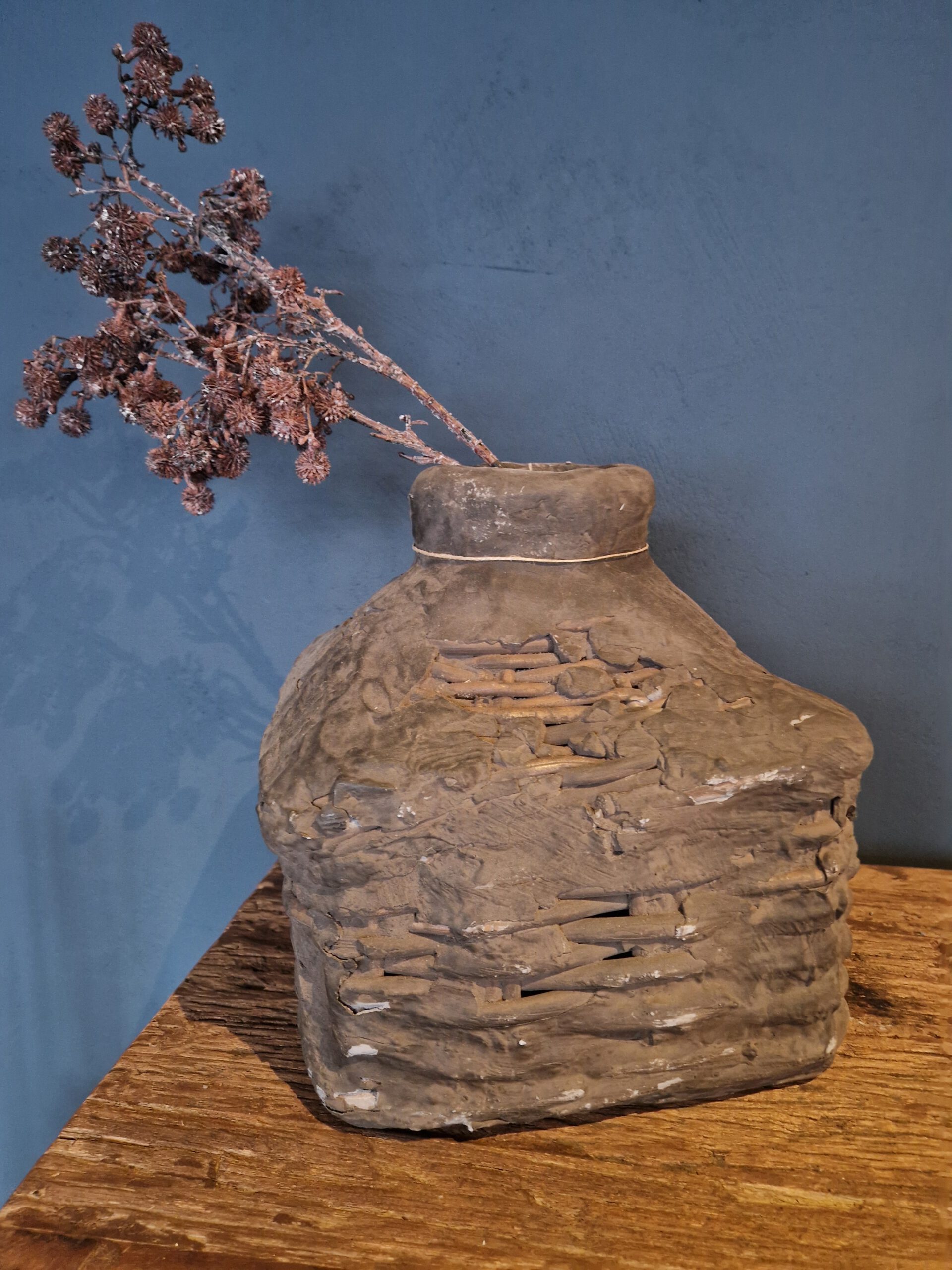 Deze prachtige leemvaas in een verfijnde grijsbruine tint heeft een unieke uitstraling door de combinatie van riet en leem. Met een hoogte van 32 cm en een breedte van 27 cm, biedt deze vaas voldoende ruimte voor grotere bloemstukken of takken. De hals van 12 cm zorgt voor een perfecte aansluiting voor bloemen of decoratieve takken. Het robuuste leem en het natuurlijke riet geven de vaas een rustieke charme, terwijl de moderne kleuren een stijlvolle touch aan je interieur toevoegen. Deze leemvaas is een ideale keuze voor wie op zoek is naar een natuurlijk, tijdloos en veelzijdig stuk decor.